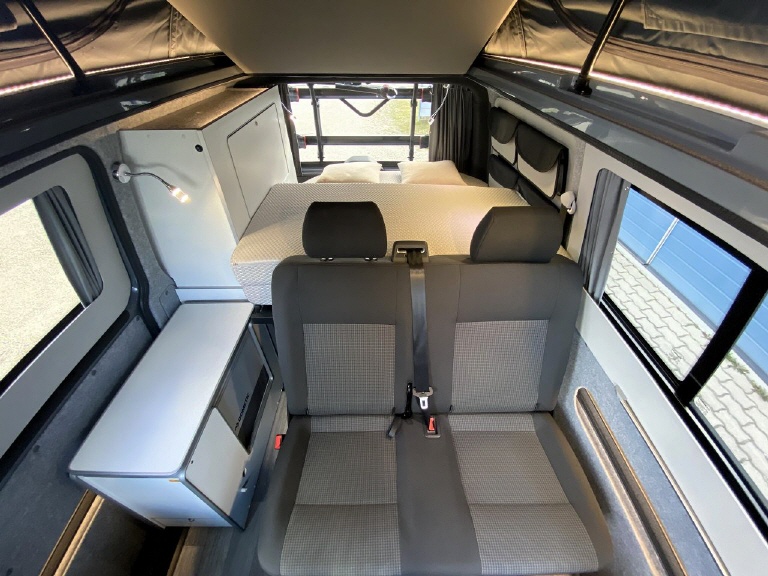 REIMO TRIOSTYLE - KUWOVANS BUS.2 Diese Variante ist vergleichbar mit dem VW California Ocean. Eine Möbelzeile mit Küche, Wasseranlage, Gasanlage, 12V und 230V Module, variable Schlafsitzbank mit 3 Sitzplätzen und 2 Schlafplätzen und ein Schlafdach - hier das Reimo EasyFit vorne hoch Zeltbalg standard -