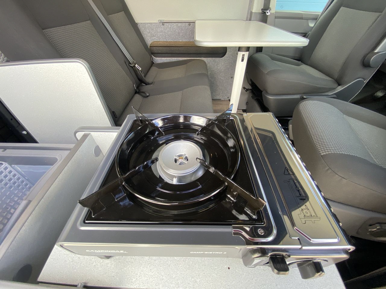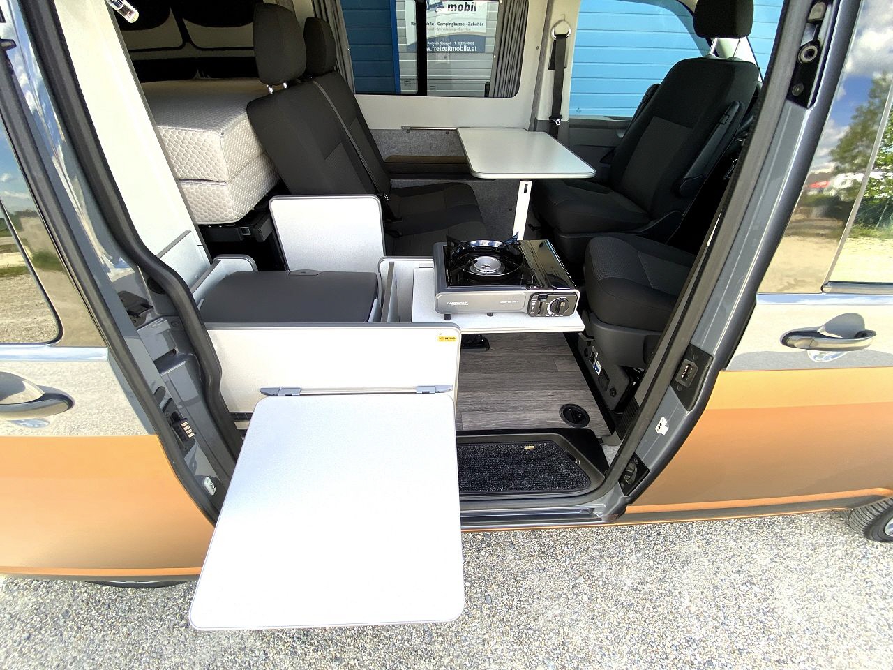 Großer Kocher mit Gaskartusche auf ausklappbarer Halterung, Kompressor Kühlbox DOMETIC CDF 18 Toploader, Lade für Geschirr/Besteck, ausklappbares Abstellbrett