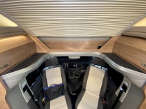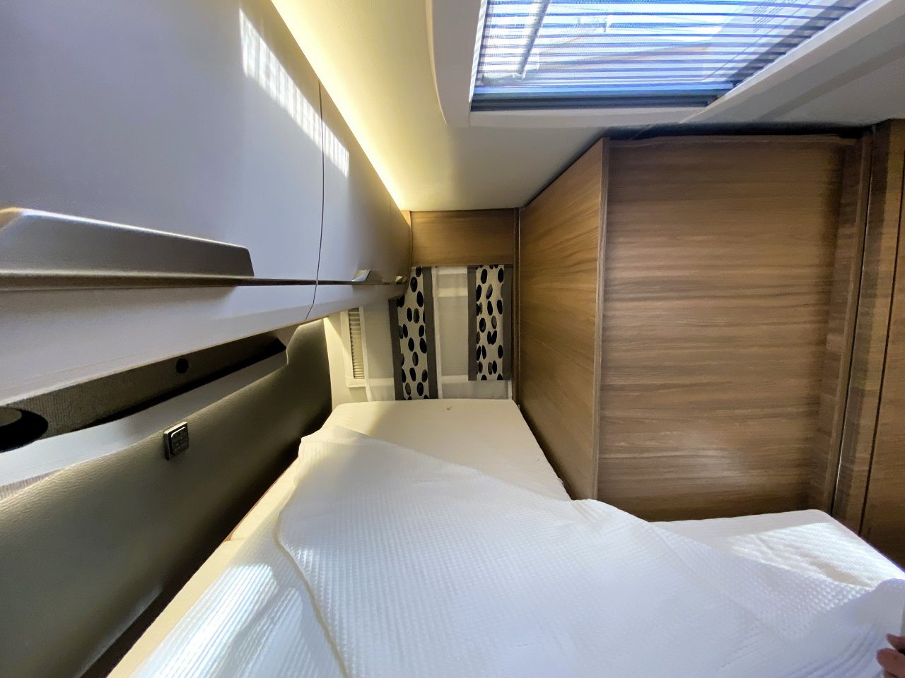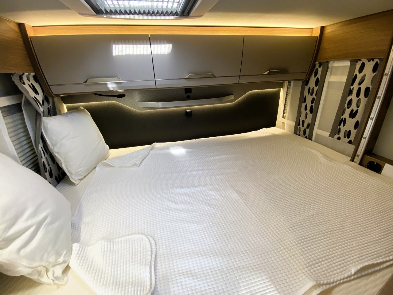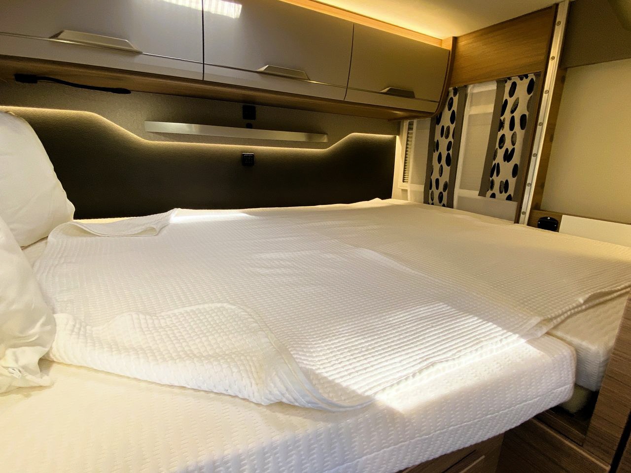 Fixbett im Heck beheizt mit Liegefläche 200 x 135cm. Unterlüftung/Lattenrost, gute Belüftung durch 2 Ausstellfenster und 1 40x40cm Dachluke - Leselampen und indirektes Ambientelicht