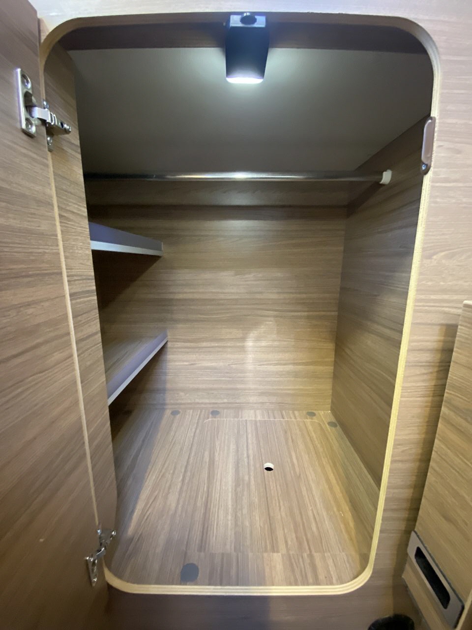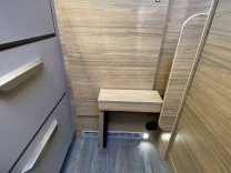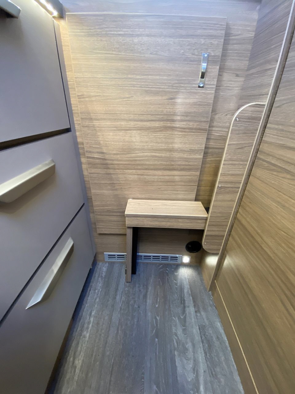 Xpand Bad mit Dusche, klappbaren Duschwänden, verschiebbares Waschbecken, THETFFORD Toilette mit Kassette 19L drehbar, Dachluke 28x28cm für gute Belüftung.