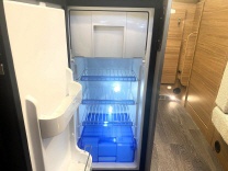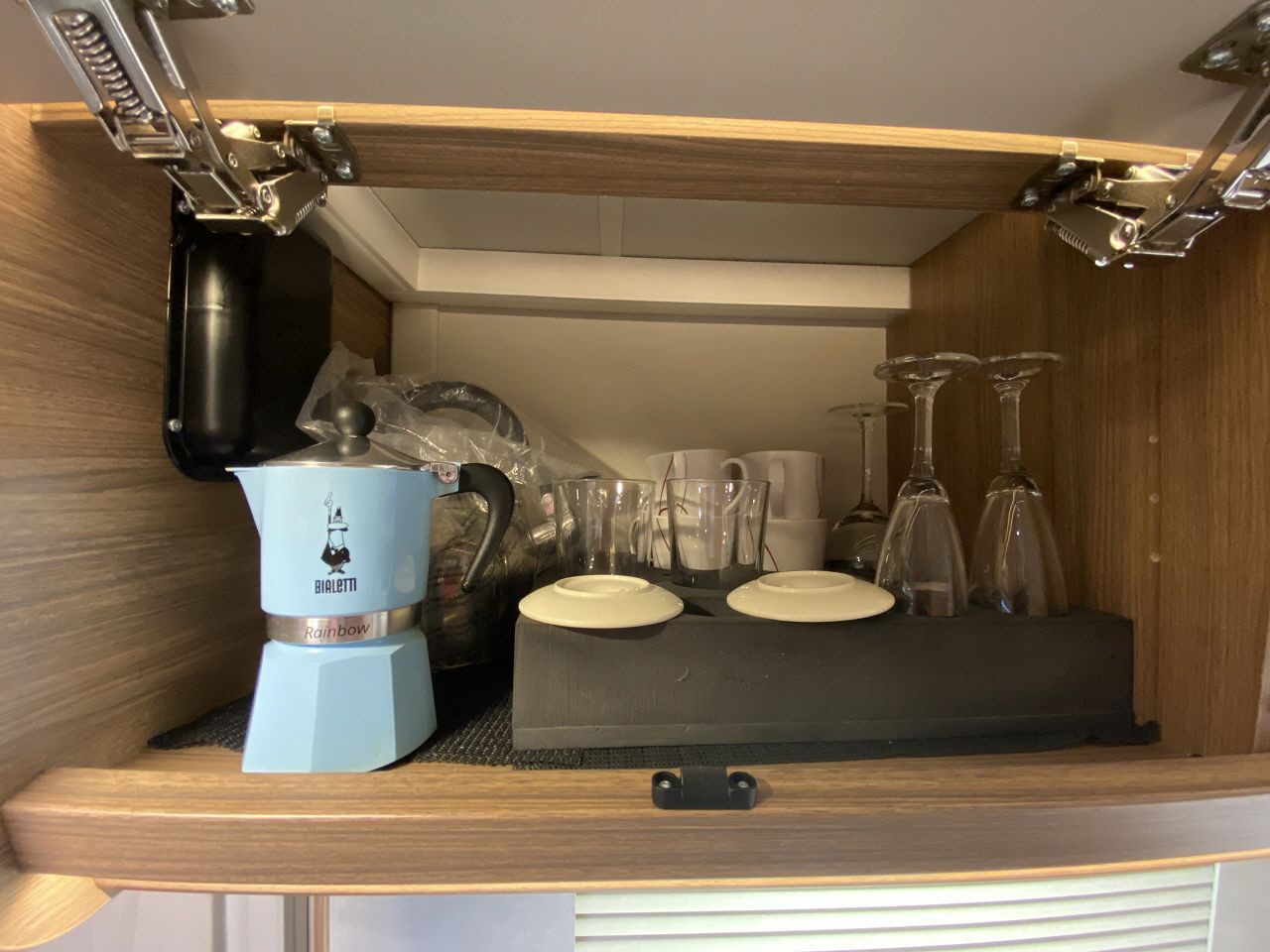 Küchenzeile mit Spüle, 2-flamm Kochfeld und 80L Kompressorkühlschrank, Staukästen oberhalb mit großen Klappen (selbstschliessend) und im Küchenblock, Laden (selbsteinziehend)