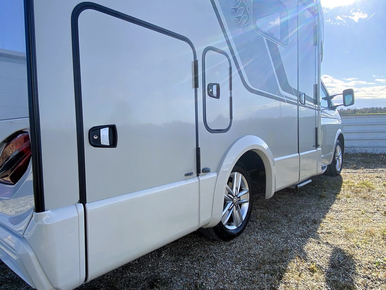Sandwich Aufbau mit ALU Glattblech an den Seitenwänden und GFK am Dach - Stärke 31/32mm (Boden 40mm) - Lackierung Aufbau in VW Farbe ASCOT Grey. Isolierung mit XFoam, beheizbarer Abwassertank