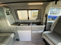 2-flamm Gaskocher, Edelstahlspüle, Wasserhahn via Tauchpunpe, Kaltwasserversorgung, Kompressorkühlschrank Dometic 45L, Laden, Rollladenschrank, Staufach
